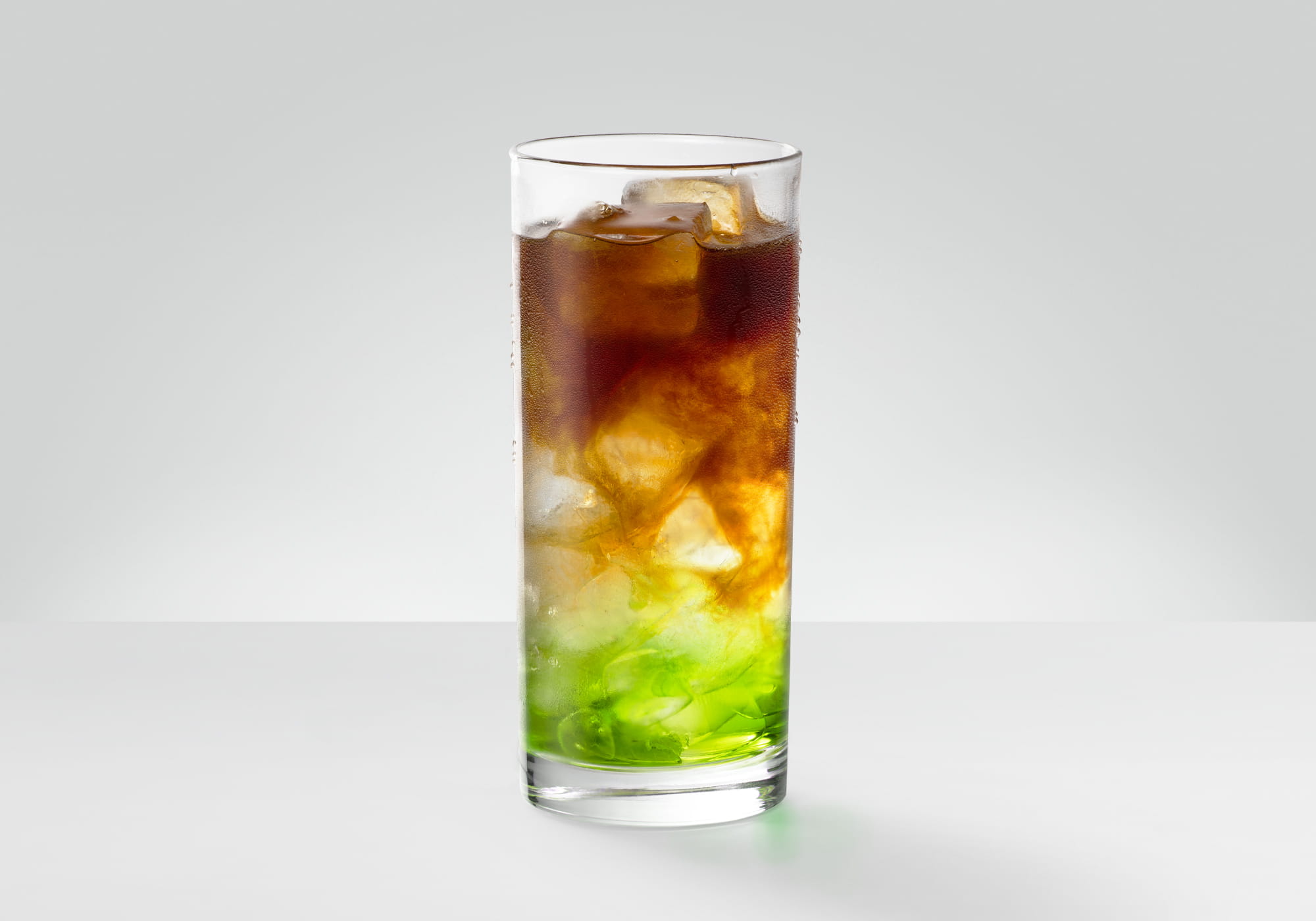 • Füllen Sie Melonenlikör und dann kohlensäurehaltige Zitronenlimonade ein bis das Glas zirka zwei Drittel gefüllt ist.